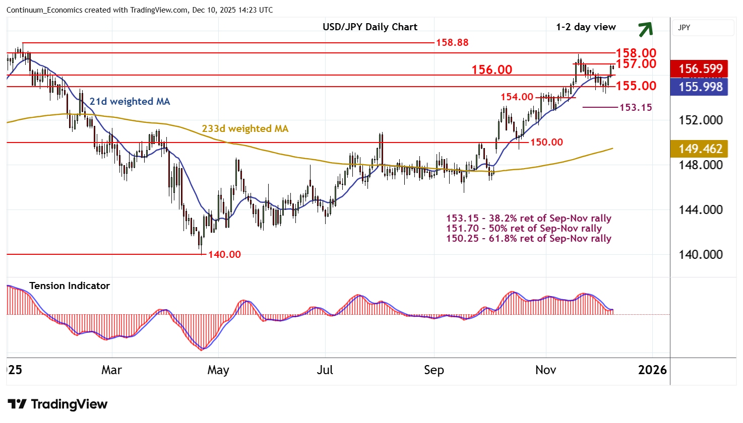 14:05 GMT - Anticipated gains have reached 157.00, where unwinding overbought intraday studies are prompting short-term reactions. A minor pullback is possible, but rising daily stochastics and the improving daily Tension Indicator are expected to limit any losses in renewed buying interest/consolidation above congestion support at 156.00. Following cautious trade, fresh gains are looked for. A break above 157.00 will open up stronger resistance at the 157.90 monthly high of 20 November and the 158.00 break level. However, flattening positive weekly readings are expected to limit any initial tests in profit-taking/consolidation. Meanwhile, a break below 156.00, if seen, will extend losses towards 155.00, where fresh buying interest is expected to appear.
