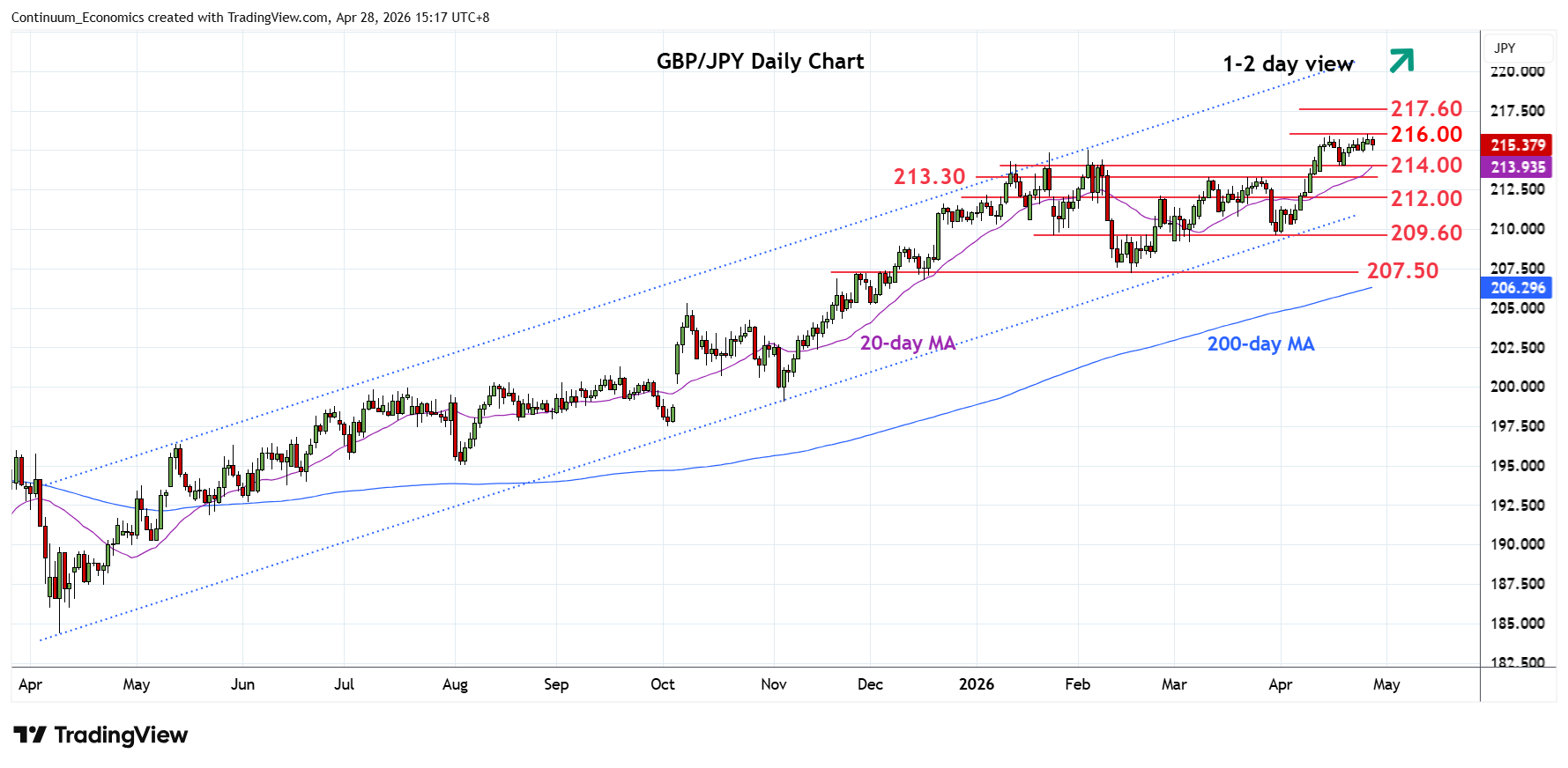 07:30 GMT - Settled back from test of the 216.00 level as prices unwind the stretched intraday studies. However, pressure remains on the upside and further gains within the bullish channel from the April 2025 year cannot be ruled out. Higher will see room for extension to resistance at 217.60, January 2008 year high. However, overbought daily and weekly studies caution corrective pullback with support raised to the 215.00/214.00, congestion area and 17 April low. Would take break here to ease the upside pressure and see room for deeper pullback to retrace gains from 207.50 February current year low.