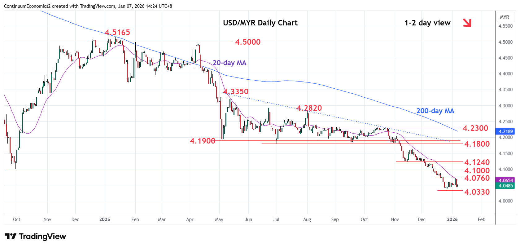 06:30 GMT - Shallow bounce from the December 2025 year low at 4.0330 met with selling pressure at 4.0760 high. Pullback threatens retest of the 4.0330 low and where break willopen up room for extension to support at 4.0280 low of February 2021. Below this will see room to the 4.0000 figure and the January 2021 year low. Meanwhile, resistance at the 4.0760 bounce high now expected to cap. Clearance here needed to open up room for stronger corrective gains to resistance at the 4.1000 level and September 2024 year low.