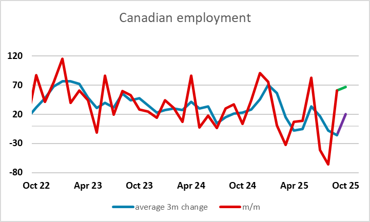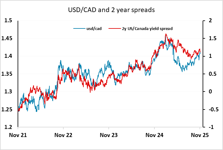 A much better than expected Canadian employment report has sent USD/CAD 50 pips lower. While the last two 60k+ gains in employment only just outweigh the previous two declines, the underlying trend looks to be flattening, while the unemployment rate has fallen back to 6.9%, and this should rule out any further near term BoC easing. Canadian yields are 5bps higher in response, and 2 year spreads no longer suggest any further USD/CAD upside. From here the next move is likely to depend on the Fed rather than the BoC. The market is pricing a 68% chance of the Fed easing at the December 10 meeting, with the outcome likely to be determined by the slew of data that comes out when the government shutdown ends. While the latest US private sector jobs surveys have been on the soft side, they aren’t conclusive by any means and still suggest a flat to slightly positive employment trend, while PMI surveys have been strong. Risks are balanced.