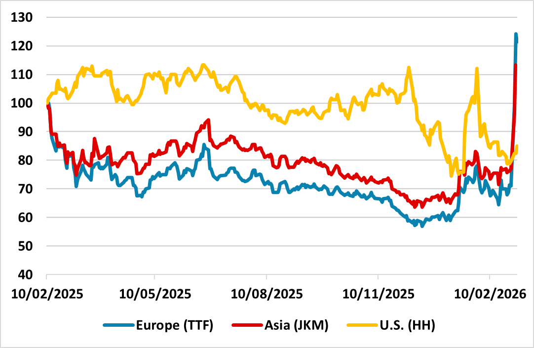 Financial markets have seen an initial reaction to the Iran war, but what happens next? Figure 1: Global Gas Prices (Feb 2025 = 100)