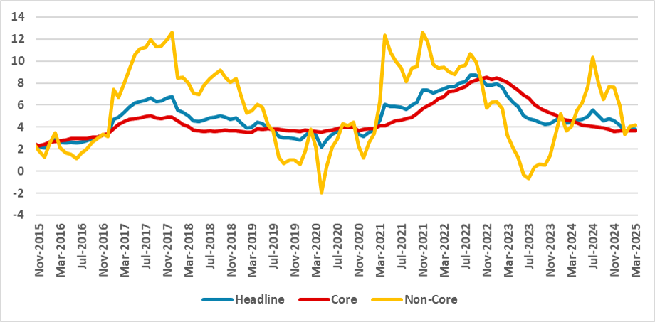 The gap between Services and Goods CPI continued to narrow. Services posted a 4.3% annual growth in March, down from 4.6% in February. Goods CPI rose slightly to 3.0% Y/Y, up from 2.7% in February. The biggest drop in the non-core category was due to lower energy prices, stemming from both electricity tariffs and fuel. Energy CPI dropped 0.5%, while agricultural goods rose 0.4%.