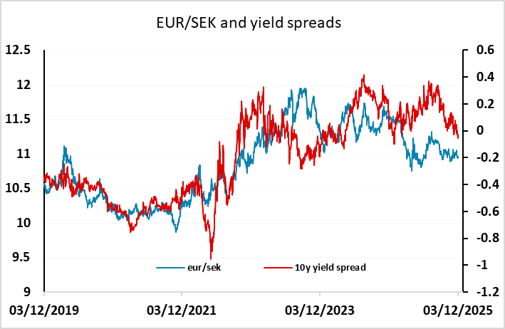 Weaker than expected Swedish CPI data this morning have pushed EUR/SEK slightly higher, gaining a figure to 10.95. Nevertheless, EUR/SEK remains fairly steady just below 11, with little chance of the Riksbank responding to softer inflation with further eaisng. The yield spread has been moving more in favour of the SEK in recent weeks, as Swedish real sector data has come out on the strong side and the market has priced out any expectation of further Riksbank easing. The Swedish curve is now flat out to one year with some risks of tightening now priced in on the 2 and 3 year horizon. However, the SEK had been outperforming yield spreads for much of the last year, so the recent rise in SEK yields has only caught up with the previous movement of the currency. Nevertheless, if we continue to see strong Swedish data there is scope for EUR/SEK to start to move lower, with the Eurozone looking less likely to generate sufficient momentum to trigger any ECB tightening in the next couple of years.