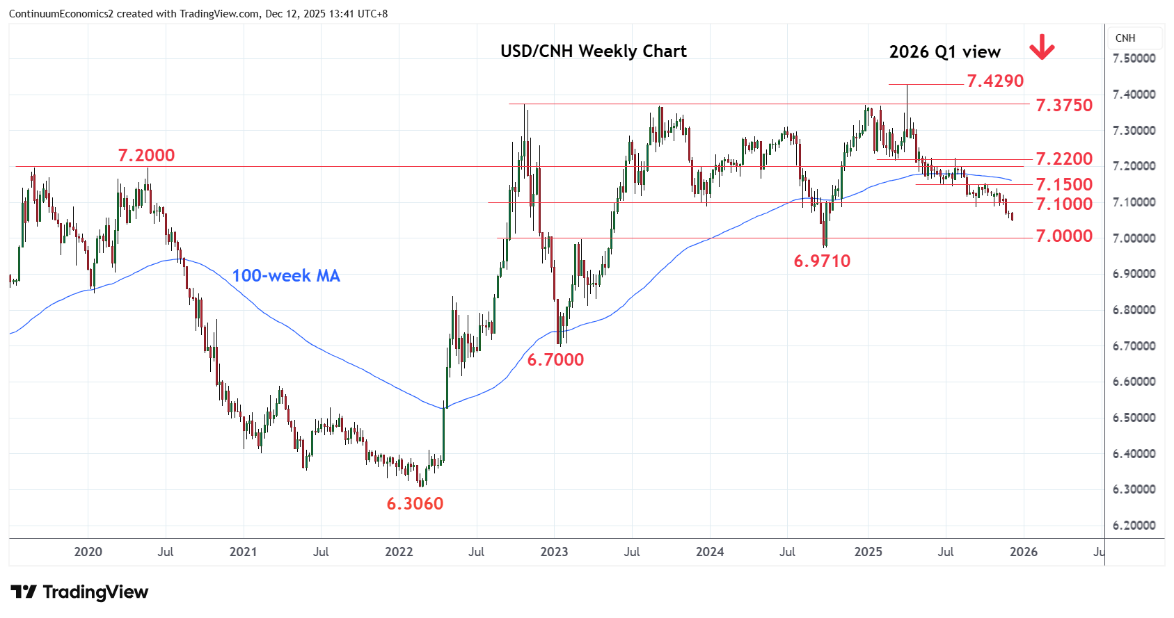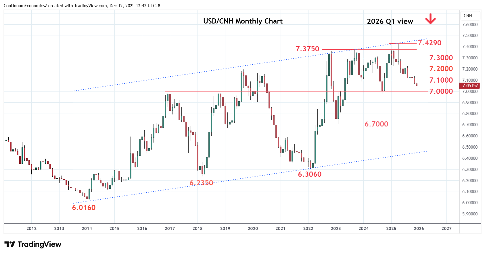 Turned lower from test of the 7.1500 resistance at the start of Q4 as consolidation above the 7.1000 level gave way to renewed selling pressure.