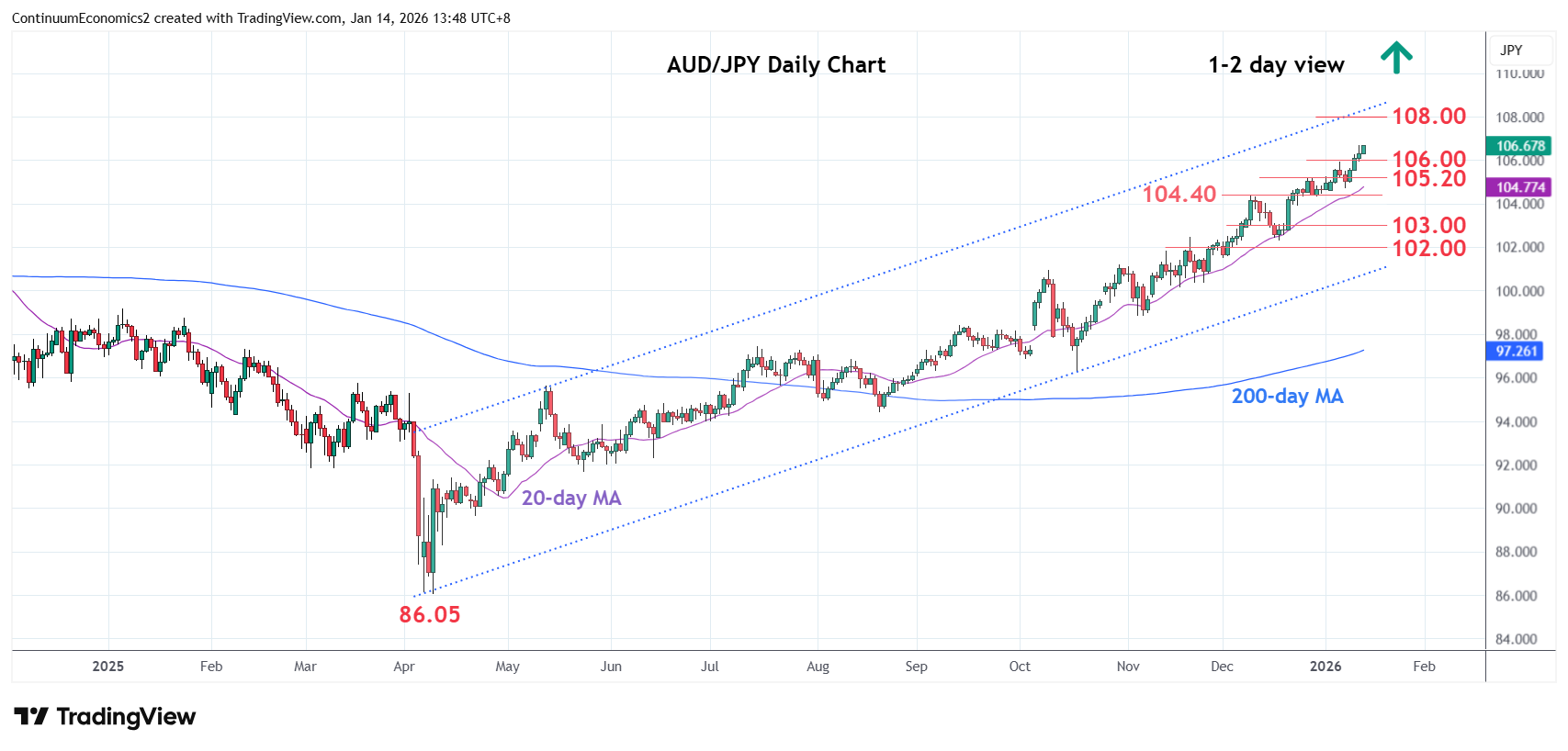 06:00 GMT - Break above the 106.00 level see prices extending bullish gains from the 86.05, April 2025 year low. Higher will see room for continuation to the 107.00/108.00 congestion area. Deep overbought daily and weekly studies suggest reaction at the latter likely but a later break here cannot be ruled out. Higher still, will turn focus to the 109.35, July 2024 year high. Meanwhile, support is raised to the 106.00 level. Would take break here to delay bulls and see room for deeper pullback to strong support at the 105.20/104.40, December highs.