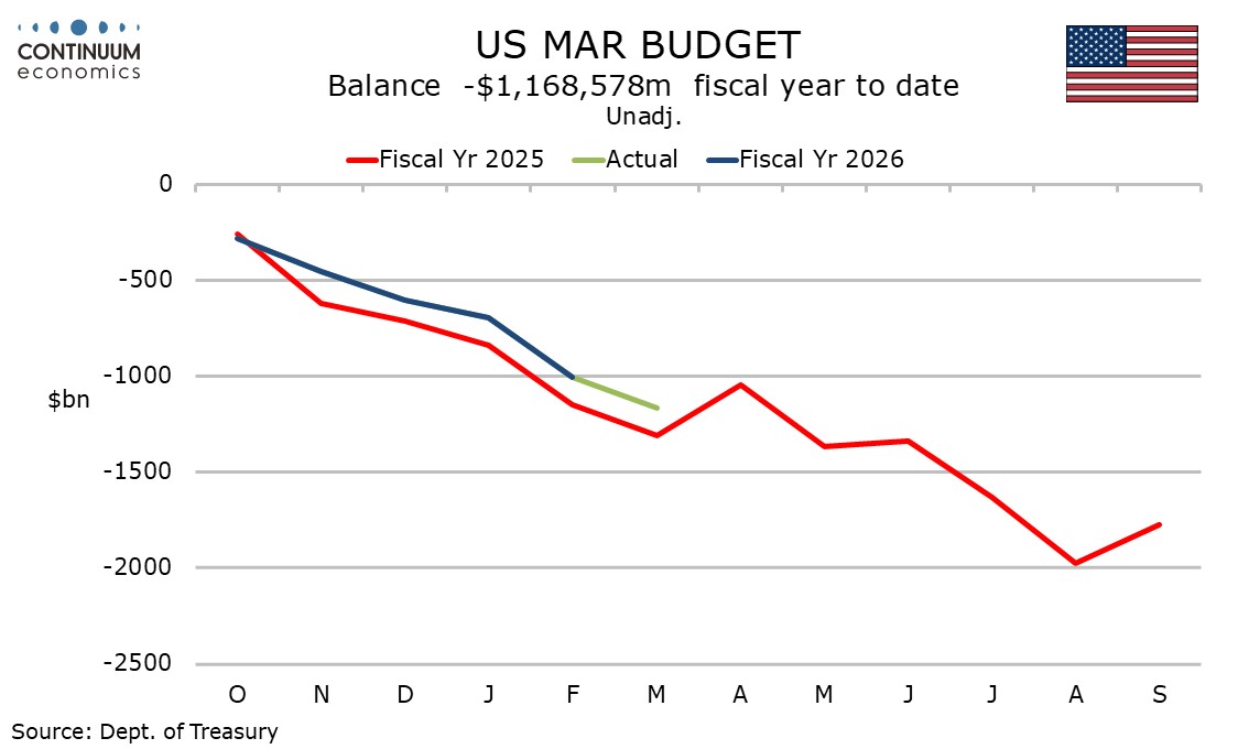 March’s budget deficit of $164.1bn is marginally up from $160.5bn in March 2025, a second straight month in which the deficit was little changed yr/yr, though the deficit is still slightly lower in the fiscal year to date.