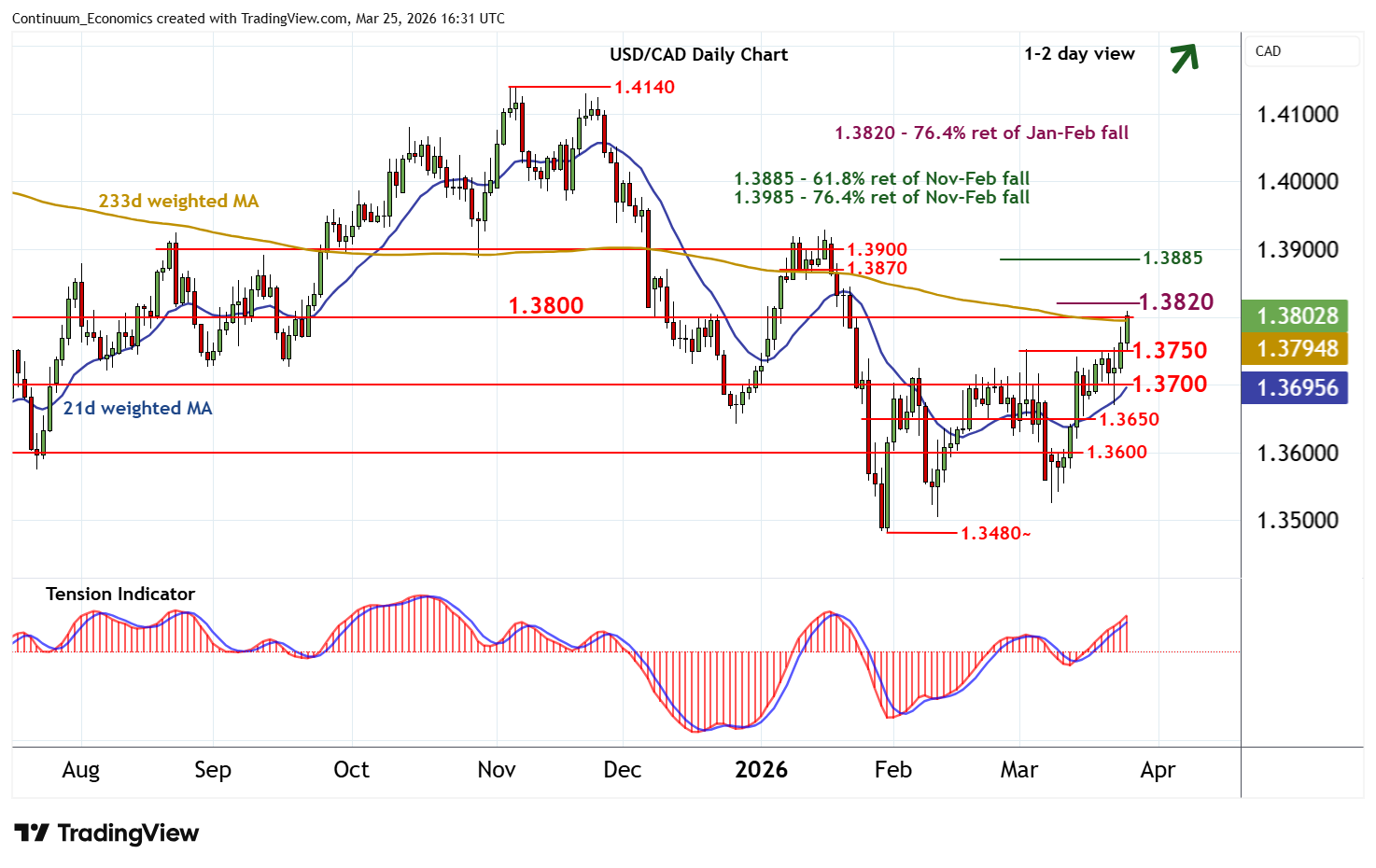 16:10 GMT - Consolidation above 1.3750 has given way to a fresh break higher, with prices currently pressuring congestion resistance at 1.3800. Just higher is the 1.3820 Fibonacci retracement, but already overbought intraday studies could limit any initial tests of this range, before rising daily readings and positive weekly charts prompt a break. A close above 1.3820 will improve sentiment and extend February gains towards resistance within the 1.3870 - 1.3800 range. Meanwhile, a close back below 1.3750, if seen, will help to stabilise price action and prompt fresh consolidation above congestion around 1.3700.