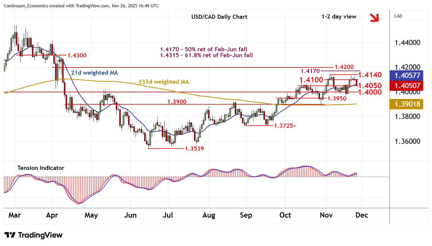 16:25 GMT - Choppy trade beneath resistance at the 1.4100 break level has given way to a sharp USD- and CAD-driven fall, with prices currently pressuring support at 1.4050. Daily readings are coming under pressure and overbought weekly stochastics are turning down, unwinding negative, divergence, suggesting room for further losses in the coming sessions. A break below 1.4050 will open up 1.4000. But the rising weekly Tension Indicator is expected to limit any initial tests in fresh consolidation. Meanwhile, resistance remains at 1.4100 and extends to the 1.4140 weekly high of 5-6 November. This range should cap any immediate tests higher.