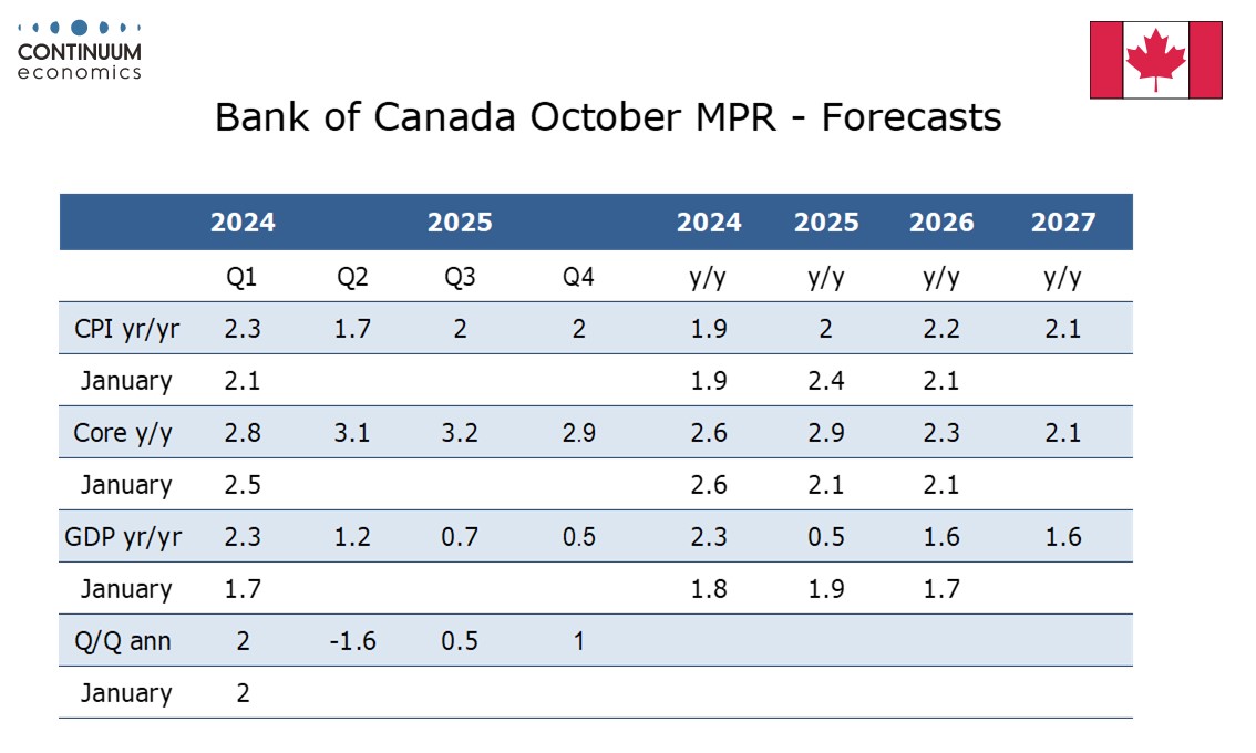 CPI is seen at 2.0% Q4/Q4 in 2025 compared to 2.4% in January but CPI has been cut by around 0.5% due to the April abolition of the carbon tax. Core inflation, seen as the average of CPI-Median and CPI-Trim is seen at 2.9% in Q4 compared to 2.1% in January’s forecast. However expanding the range of indicators and considering the distribution of components leads the BoC to see underlying inflation as around 2.5% and it expects this pace to ease in the months ahead. A surprisingly strong September CPI of 2.4% yr/yr does not seem to have caused much alarm with Q4 seen at 2.0%. The BoC has also downplayed a surprisingly strong September employment report, noting that it followed two sizeable losses and describing the labor market as remaining soft.