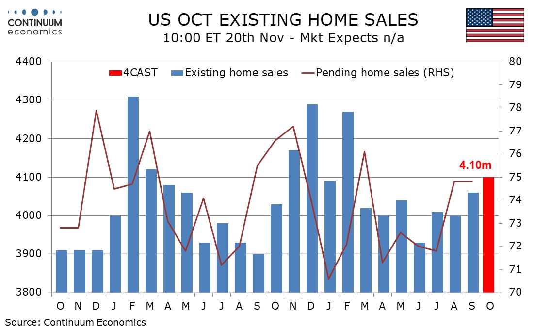 We expect October existing home sales to increase by 1.0% to 4.10m, extending a 1,.5% rise in September to reach the highest level since February, as the housing market gets support from lower mortgage rates as Fed easing resumes.