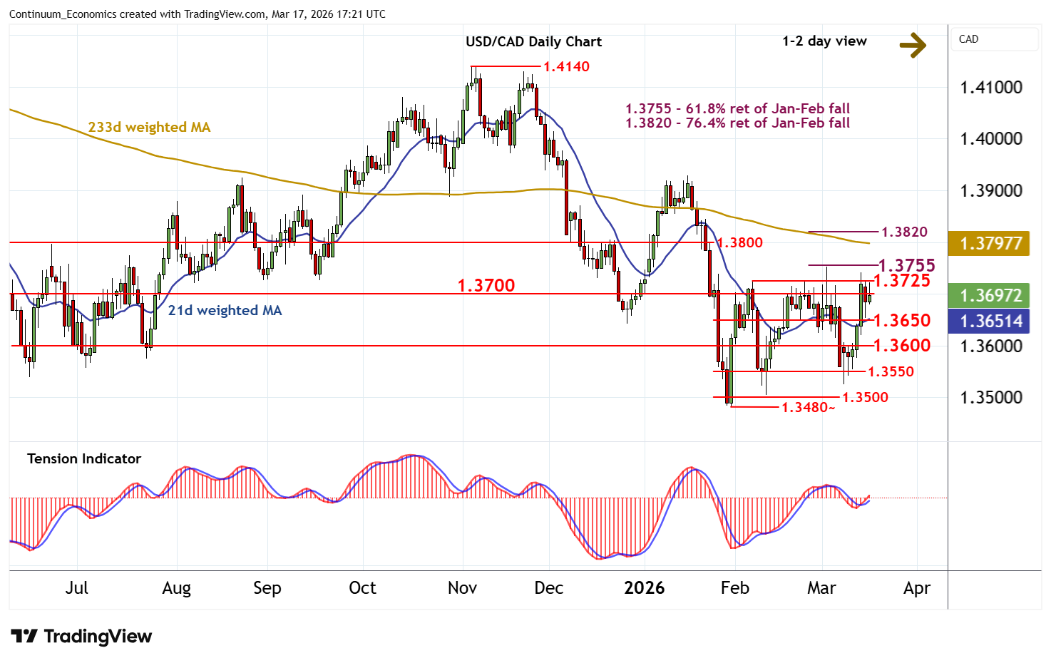 17:05 GMT - The pullback to congestion support at 1.3650 has given way to a bounce, as oversold intraday studies unwind, with prices currently balanced around resistance at congestion at 1.3700 and the 1.3725 monthly high of 6 February. Daily readings continue to rise and broader weekly charts are improving, suggesting room for further strength in the coming sessions. But a close above the 1.3755 Fibonacci retracement is needed to turn sentiment positive and extend late-January gains towards 1.3800/20. Meanwhile, support at 1.3650 should underpin any immediate setbacks.