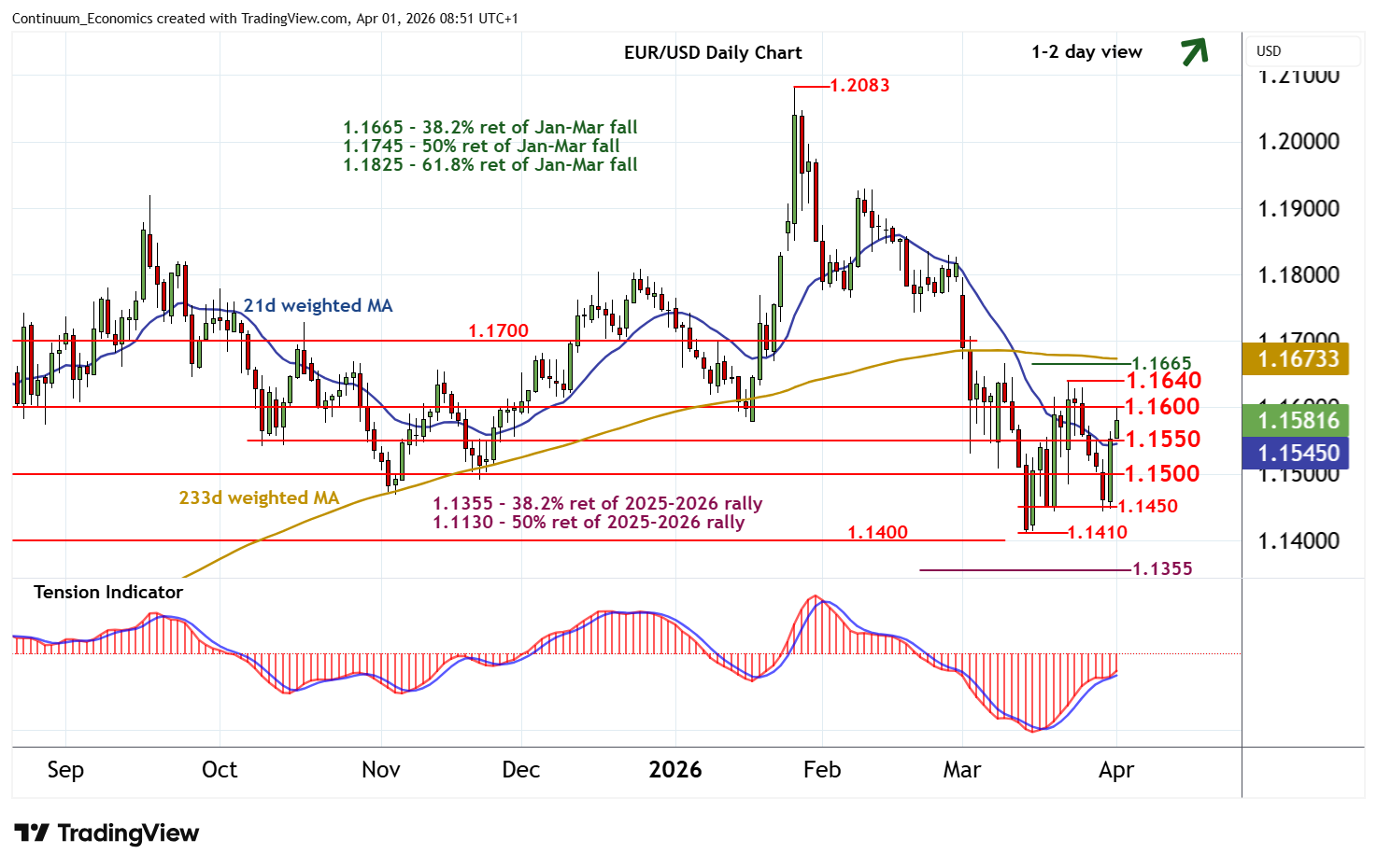 08:35 BST - Consolidation above 1.1450 has given way to a sharp bounce in short-covering, with prices currently pressuring congestion resistance at 1.1600. Rising daily readings and unwinding oversold weekly stochastics highlight room for continuation towards the 1.1640 weekly high of 23 March. Just higher is the 1.1665 Fibonacci retracement. But the negative weekly Tension Indicator and bearish longer-term readings should limit any immediate tests of this range in fresh consolidation. A close above here, however, will improve sentiment and extend March gains initially to congestion around 1.1700. Meanwhile, support is raised to congestion around 1.1550. A close beneath here, not yet seen, will help to stabilise sentiment and prompt consolidation above further congestion around 1.1500.