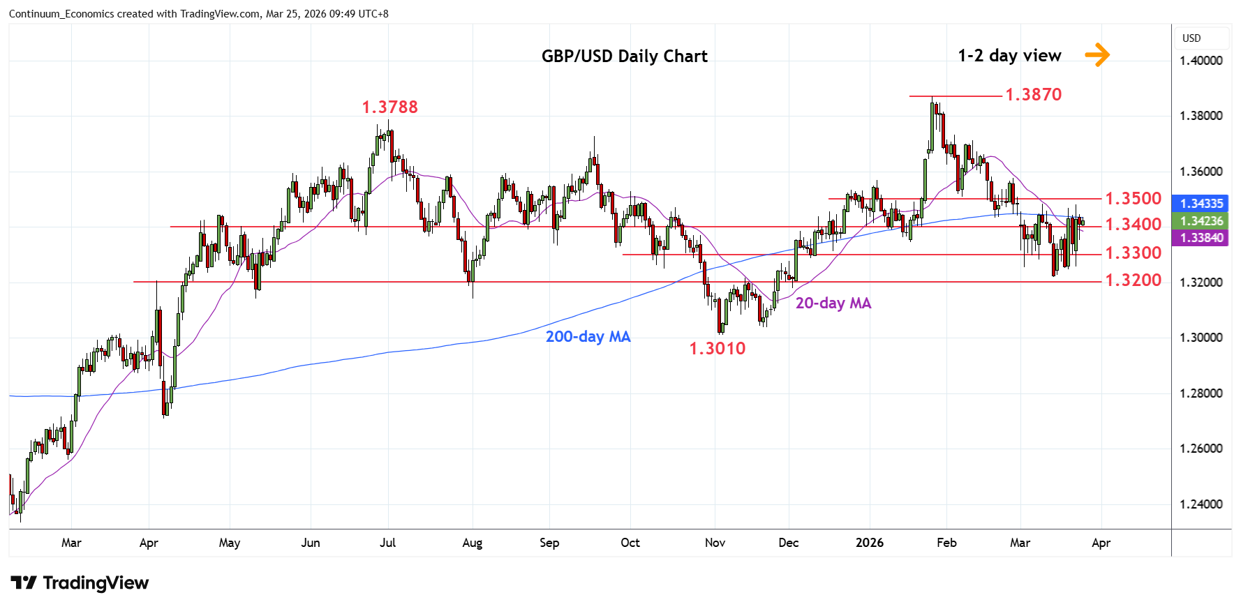 01:50 GMT - Still limited above the 1.3400 level as the 200-day MA at 1.3435 keep gains in check. Positive daily studies keep pressure on the upside and break here and the 1.3480 high will confirm a 3-week bottom pattern in place at the 1.3213 low and open up room to strong resistance at 1.3500/10 area. Clearance here revive the upside focus and see room to the 1.3600 level. Meanwhile, support remains at the 1.3350/1.3300 congestion area which should underpin and sustain bounce from the 1.3213, 13 March current year low.
