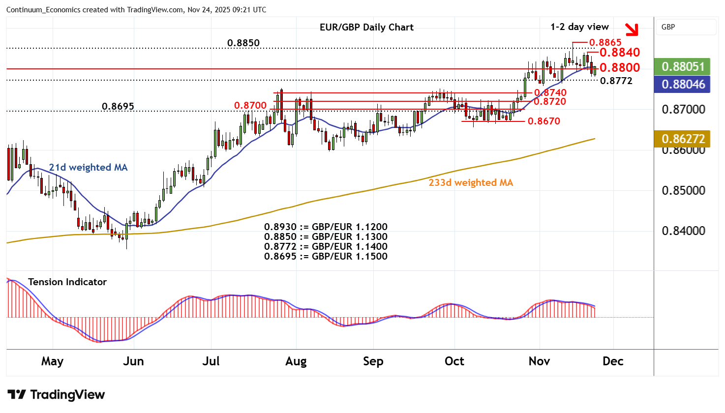 09:15 GMT - The break below 0.8800 has met anticipated buying interest above 0.8772, (GBP/EUR 1.1400), as oversold intraday studies unwind, with prices once again trading above 0.8800. Daily readings continue to track lower and overbought weekly stochastics are unwinding, highlighting a deterioration in sentiment and room for fresh losses in the coming sessions. A close below 0.8772 will add weight to sentiment and extend losses into 0.8720/40. Meanwhile, resistance is at the 0.8840 weekly high of 20 November and extends to 0.8850. This range should cap any immediate tests higher.