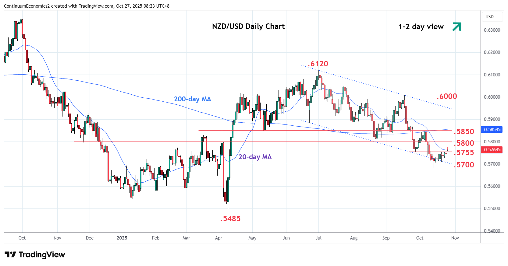 00:30 GMT - Bounce at the opening above the .5755 see prices extending gains from the .5683 low of 14 October. Focus now turn to strong resistance at the .5800 level and August low, which is expected to cap. Clearance, if seen, will open up room for stronger gains to retrace losses from .6000 level and channel resistance from .6120 July high to resistance at the .5845/50 area. Meanwhile, support is raised to .5755 which is expected to underpin and sustain gains from the .5700 level and .5683 low.