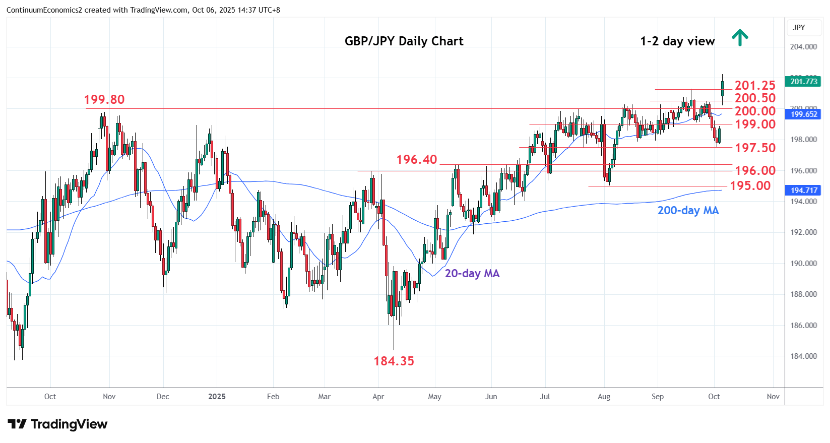 06:40 GMT - Gapped up opening above the 200.00 figure has seen gains to reach fresh year high above the 202.00 level. Positive daily and weekly studies suggest consolidation here to give way to further gains later to further retrace losses from the July 2024 year high. Break will turn focus to strong resistance at 204.00/20, congestion and 19 July 2024 high. Meanwhile, support is raised to the 200.00 figure and July high which is expected to underpin. Below this will ease the upside pressure and see room for consolidation to the 199.00/198.00 congestion and 197.50 support.