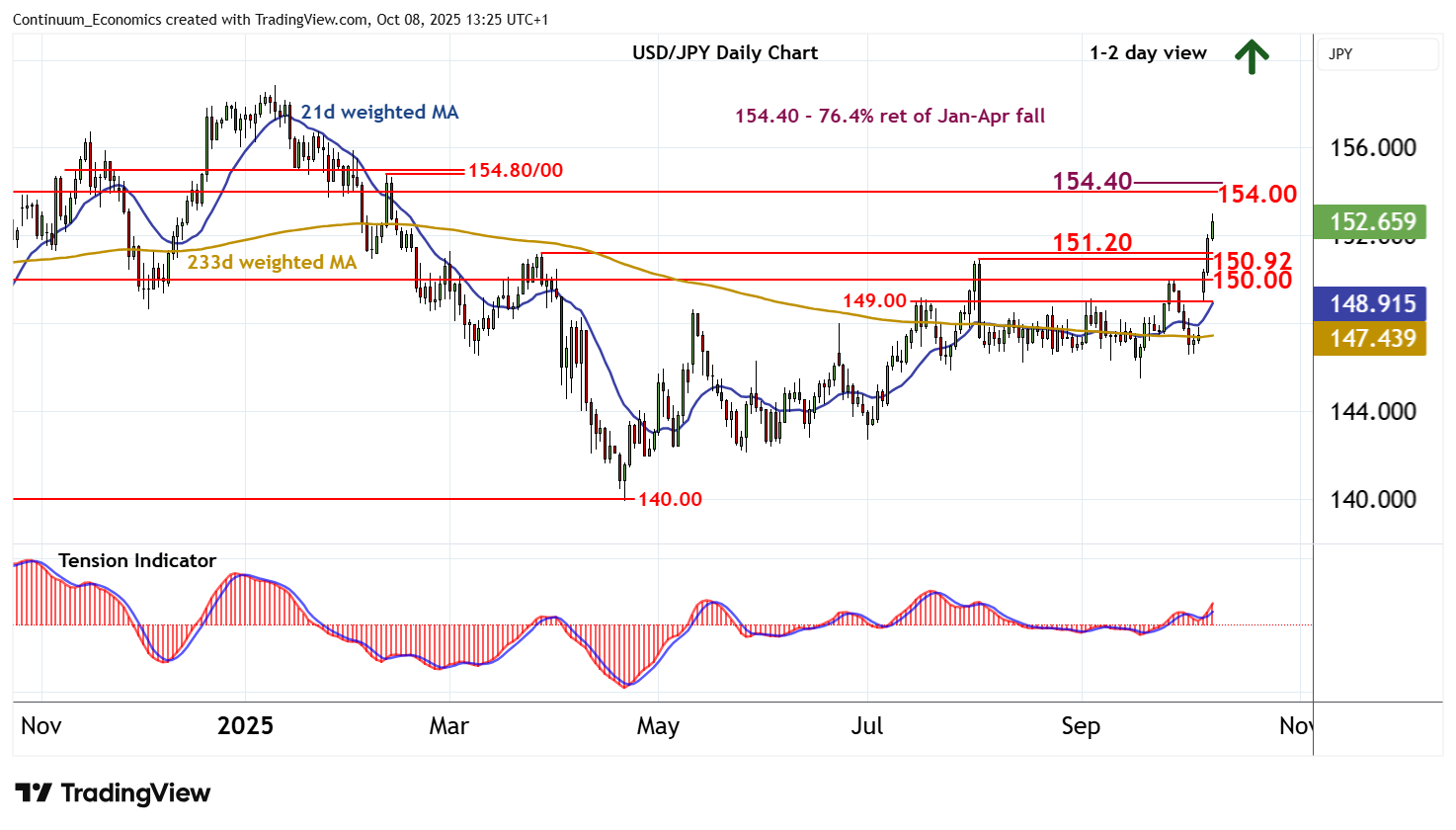 13:10 BST - Anticipated gains have extended higher in sharp JPY-driven trade, with prices posting a fresh year high at 153.00 before settling back. Daily readings continue to track higher and broader weekly charts are positive, pointing to room for still further gains in the coming sessions. A break above 153.00 will extend April gains towards critical resistance at congestion around 154.00 and the 154.40 Fibonacci retracement. However, already overbought daily stochastics are expected to limit any initial tests of this range in consolidation/profit-taking. meanwhile, support is raised to the 150.92 - 151.10 monthly highs from March-August. A close beneath here, if seen, would turn sentiment neutral and prompt consolidation above congestion around 150.00.