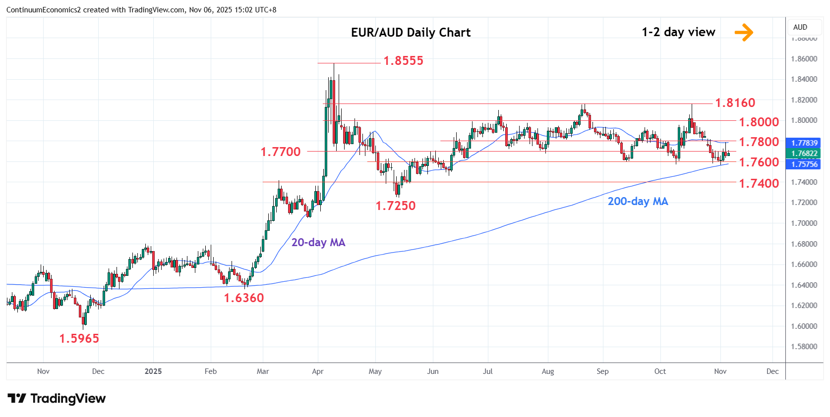 07:30 GMT - Turned up in consolidation from the 1.7600/1.7570 September/October range lows as prices unwind oversold daily studies. However, shallow bounce keep pressure on the downside see risk for break here to confirm a double top at the August/October highs. Lower will see room for deeper pullback to retrace gains from the May low to support at the 1.7500/1.7460, congestion and June low, and the 1.7400 level. Meanwhile, resistance at the 1.7700/1.7800 congestion area expected to cap and sustain losses from 1.8160 high.