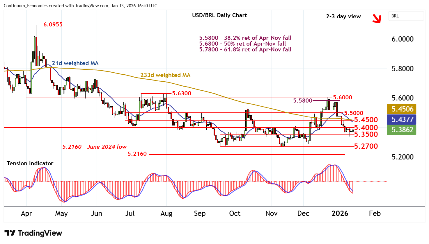 16:30 GMT - Little change, as prices extend cautious trade within the 5.3500 - 5.4000 range. Daily readings are mixed/negative and broader weekly charts are under pressure, highlighting room for fresh losses in the coming sessions. A break below congestion support at 5.3500 will add weight to sentiment and open up critical support at the 5.2700 year lows from September-November. A close beneath here would add extra weight to already bearish price action and confirm continuation of December 2024 losses. Meanwhile, resistance is at congestion around 5.4000 and extends to 5.4500. This broad range is expected to cap any immediate tests higher.