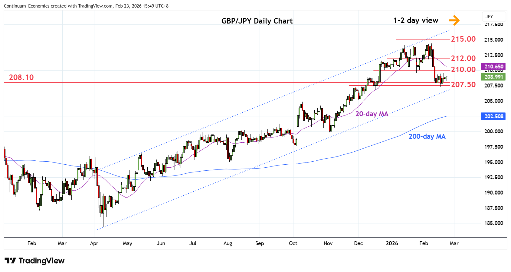 07:50 GMT - Little change, as prices extend choppy trade above support at the 208.10/207.50 area and consolidate losses from the 215.00, 4 February current year high. The resulting flag pattern suggest consolidation giving way to renewed selling pressure later to see deeper pullback to retrace gains from the April 2025 year low. Break will see room to support at the 206.00 congestion and 205.30/00 area. Meanwhile, resistance at the 210.00 level is expected to cap. Lift over this, if seen, will see room for stronger bounce to resistance at the 212.00 level.