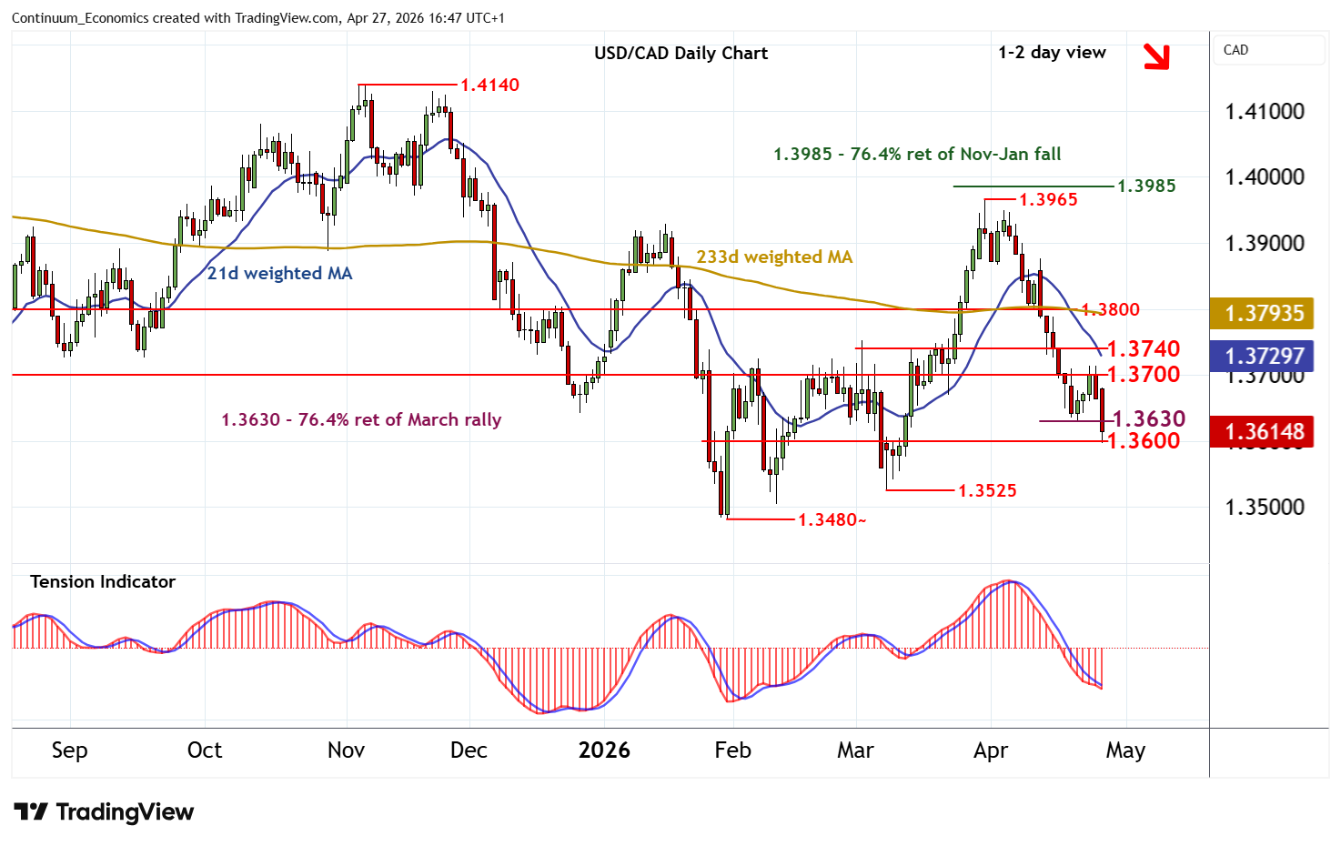 16:35 BST - Cautious trade has given way to a fresh pullback in both USD- and CAD-driven trade, with prices currently pressuring support within the broad 1.3600 - 1.3630 range. Oversold intraday studies are flattening, suggesting room for consolidation within here. But deteriorating daily readings and bearish weekly charts point to room for further losses in the coming sessions. A close beneath here will add weight to sentiment and extend late-March losses towards the 1.3525 monthly low of 9 March. Meanwhile, resistance remains up to congestion around 1.3700 and should cap any immediate tests higher.