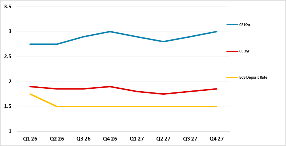 · The ECB increased its 2026 GDP and inflation forecast and appears happy with current policy rate levels. However, still tight financial conditions, plus easing wage growth, point to disinflation and growth disappointment. We see this switch the ECB from an on hold message to easing in a further two 25bps steps in 2026 to 1.50% ECB depo rate.