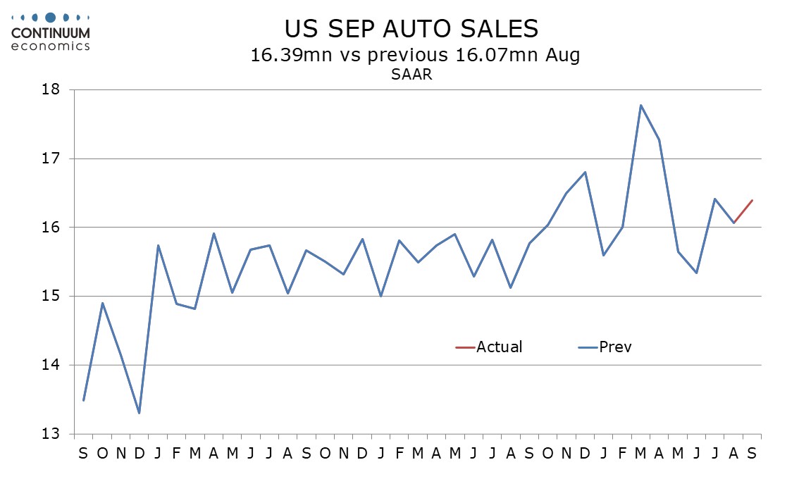 Industry data shows auto sales saw a modest bounce in September to reverse a modest decline in August. Retail auto data in contrast managed a modest increase in August so we do not expect a strong rise in September retail auto sales.