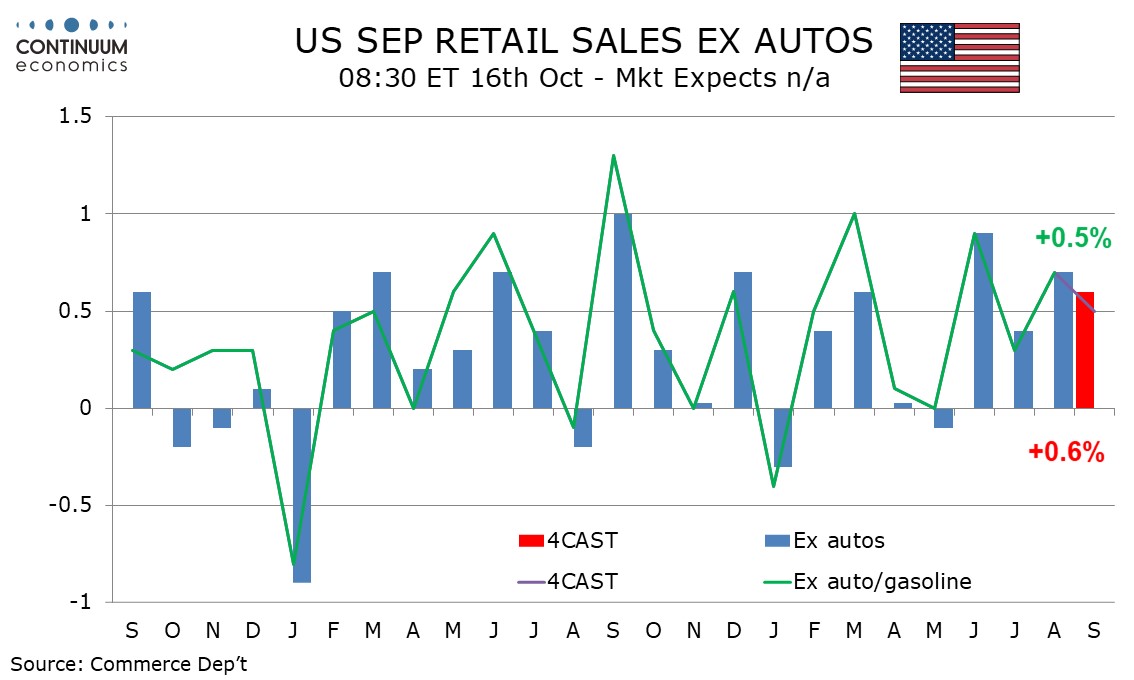 We expect a third straight 0.6% increase in retail sales in September, with slightly over half of the increase coming in prices, leaving only moderate growth in real terms. We also expect 0.6% increase ex autos but a slightly weaker 0.5% increase ex autos and gasoline.