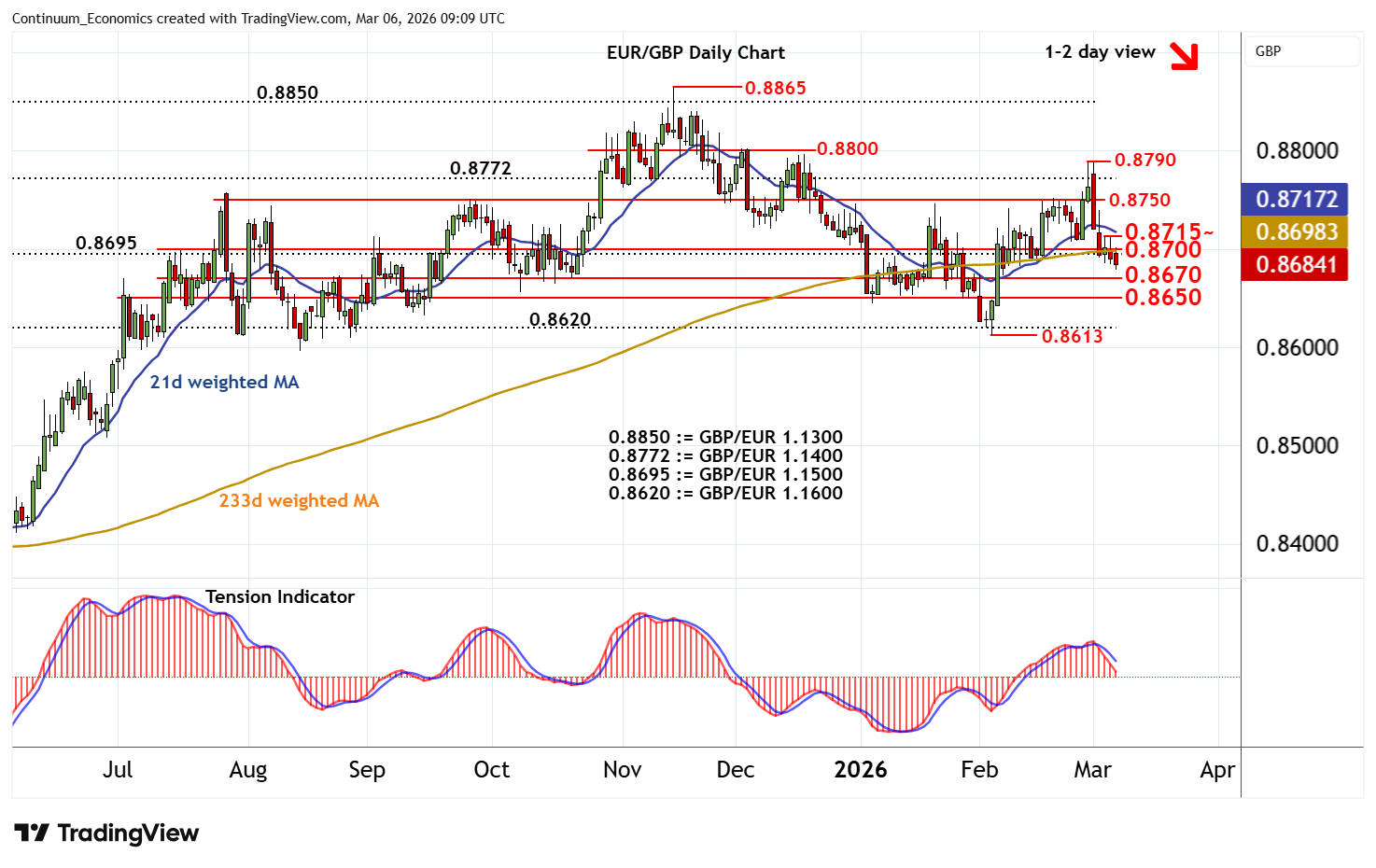 09:00 GMT - Cautious trade is giving way to the anticipated test lower, as intraday studies turn down, with the break below 0.8695/00 opening up congestion support at 0.8670. The daily Tension Indicator is also falling, pointing to room for continuation beneath here. Focus will then turn to further congestion around 0.8650. But flat oversold daily stochastics and rising weekly charts should limit any initial tests in short-covering/consolidation. Meanwhile, resistance is lowered to 0.8695, (GBP/EUR 1.1500), and congestion around 0.8700. A close back above here, if seen, would help to stabilise price action and give way to consolidation beneath the 0.8715~ high from 4-5 March.