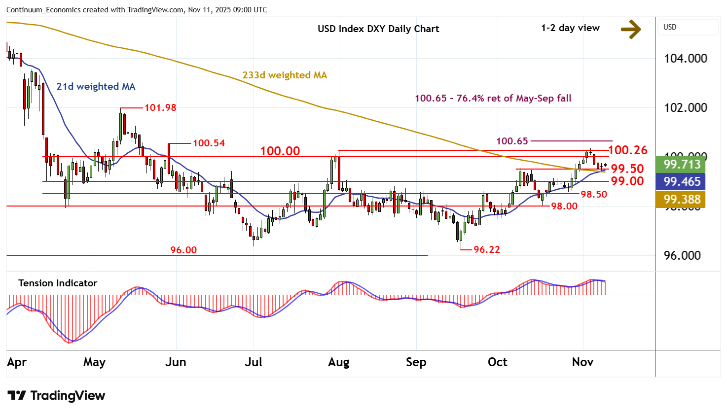 Little change, as mixed intraday studies keep near-term sentiment cautious and extend consolidation above support at the 99.50 break level