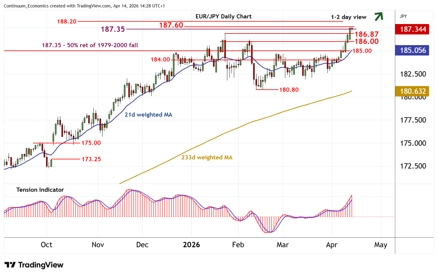 14:15 BST - Anticipated gains have posted a fresh multi-year high within strong resistance at the 187.35 multi-decade Fibonacci retracement and the 187.60 high of August 1990. Overbought daily stochastics are flattening, suggesting potential for consolidation within here, before the rising daily Tension Indicator and improving weekly charts prompt further gains. A close above here will improve sentiment and extend long-term gains towards critical resistance at the 188.20~ multi-year high of May 1990. Meanwhile, support is raised to the 186.87 monthly high of 23 January. A close beneath here would help to stabilise price action and prompt consolidation above congestion around 186.00.