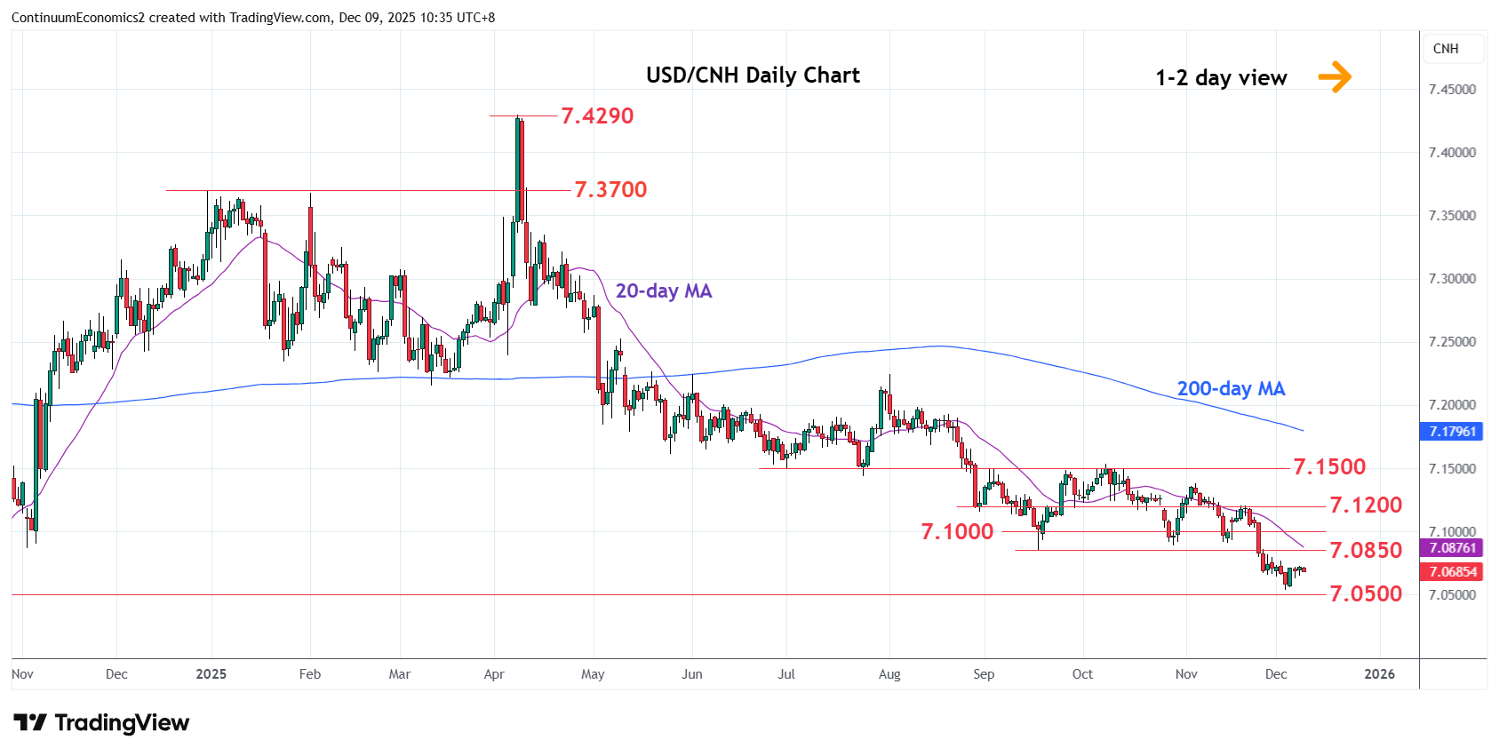 02:40 GMT - Drifting narrowly around the 7.0700 level following bounce from the 7.0540 low as prices unwind oversold intraday and daily studies. Higher will see room to resistance at the 7.0800/50 congestion and September low which is expected to cap. Would take break here to see room for stronger bounce to resistance at the 7.1200 level. However, corrective bounce is expected to give way to fresh selling pressure later. Below the 7.0540 low and 7.0500 level will see room for extension to 7.0350 congestion area from October 2024. Lower still, will see potential to the 7.0000 figure and the 6.9710, September 2024 year low.