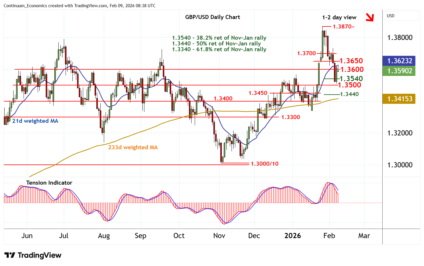 08:10 GMT - The bounce from support within congestion around 1.3500 and the 1.3540 Fibonacci retracement has reached congestion resistance at 1.3600, where mixed intraday studies are prompting short-term consolidation, Daily stochastics and the daily Tension Indicator are under pressure, however, suggesting any fresh tests above here could be limited in renewed selling interest towards resistance at the 1.3650 break level. In the coming sessions, focus is expected to turn back to 1.3500/40. But mixed weekly charts should limit any initial break in further consolidation above 1.3440/50.