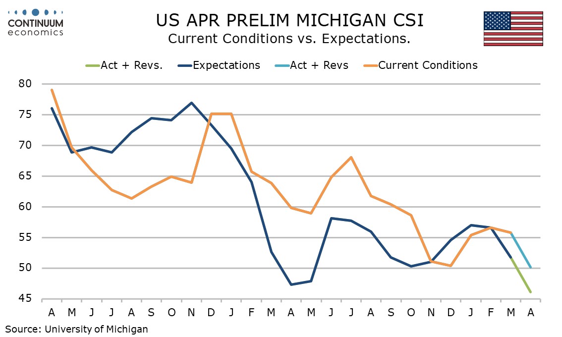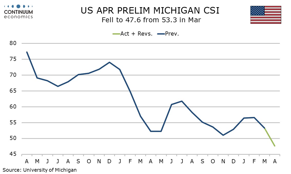 The preliminary April Michigan CSI of 47.6 from 53.3 is a record low but the monthly decline of 5.7 points, while significant, is not as large as a 7.7 point fall in March 2025 when tariff worries were building. Inflation expectations are up sharply on a one-year view, and modestly on a 5-10 year view.