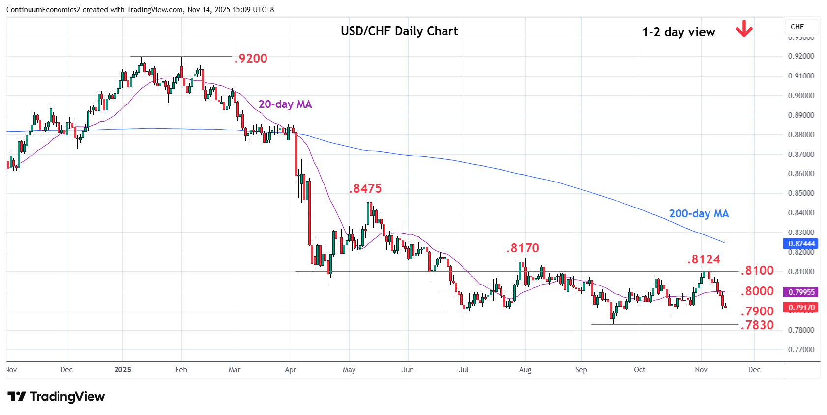 Under pressure, as prices extend losses from the .8124 high of last week to approach the .7900 level