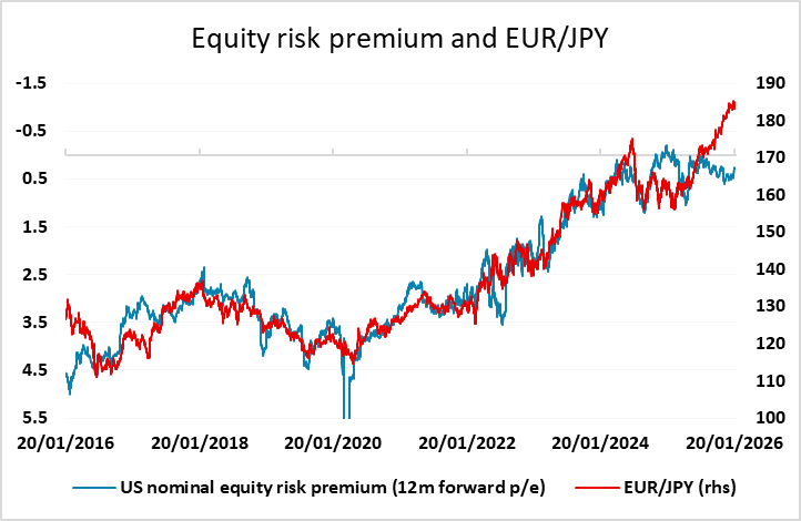 The market focus may, however, continue to be more on the Greenland situation than on data. European opposition to the US claiming the territory is clear, and the threat of tariffs isn’t going to change their minds. If tariffs are imposed in an attempt to pressure Europe, we are likely to see some extension of the equity market weakness we saw on Monday, which ought to lead to some more risk negative trading. However, the FX market reaction has so far been more USD negative than risk negative, with the JPY actually losing ground on the crosses on Monday. This may reflect the fact that the USD lost ground after the reciprocal tariffs were announced in April, with the JPY also underperforming from June as equities recovered from the initial losses. Indeed, the JPY failed to gain on the crosses despite the initial decline in equities. However, we expect it will be different this time around, as the focus is completely on Europe this time, and we are starting at much higher levels of equities and of EUR/JPY. We consequently see more scope for JPY gains.