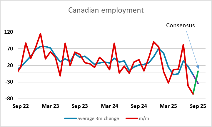 USD/CAD made a 5 month high on Thursday above the May 19 high of 1.3973, supported by a generally USD positive tone. The Fed is still priced as a 95% chance to cut rates 25bp at the October 29 meeting, so if both go ahead, there is scope for the CAD to weaken further, with a USD/CAD likely to trade above 1.40. We have already nearly returned to the level consistent with the historic correlation with 2 year yield spreads, so we wouldn’t see a lot of CAD downside, and there would likely be a bigger reaction if the BoC don’t cut. So a large rise in employment could be expected to result in a significant CAD recovery, as the market reduces its expectation of easing. But this looks less likely than a USD/CAD test above 1.40 on a consensus number.