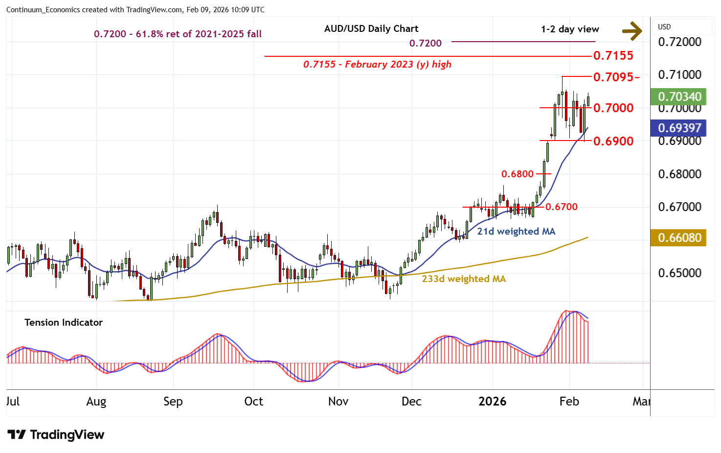 09:50 GMT - The sharp bounce from strong support at 0.6900 has reached 0.7030. Intraday studies are mixed/positive, suggesting room for continuation towards minor resistance at 0.7050. But negative daily stochastics and the bearish daily Tension Indicator should limit any break in renewed selling interest/consolidation towards critical resistance at the 0.7095~ current year high of 29 January. Broader weekly charts are positive and longer-term readings are also rising, highlighting room for a later break and continuation of April 2025 gains towards strong resistance within the 0.7155~ year high of February 2023 and the 0.7200 Fibonacci retracement. Meanwhile, support is at congestion around 0.7000. A test back beneath here, if seen, should meet renewed buying interest towards 0.6900.