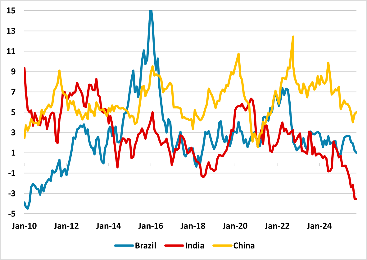 China’s equities optimism in August/September has been tempered and the market needs fresh good news for 2026. Valuations are no longer cheap in equity terms or against real government bond yields (Figure 4), though some are looking at earnings yield-nominal government bond yield spreads to support the market. China’s 2025 corporate earnings growth estimates have also been revised down, but this also needs to happen to 2026/27 earnings to be more consistent with 5% nominal GDP growth (given the excess of production over domestic demand).