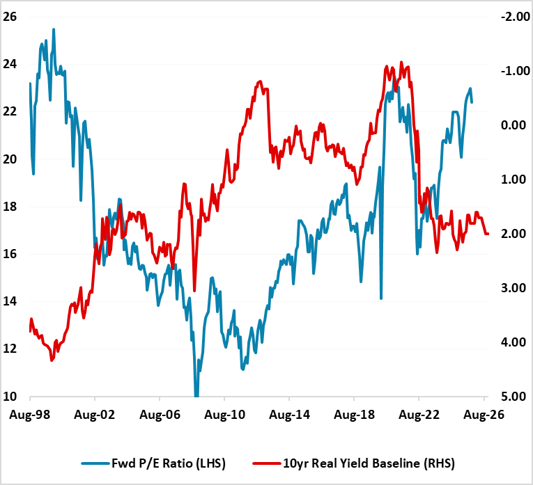 Figure 1: 12mth Fwd S&P500 P/E Ratio and 10yr Real U.S. Treasury Yield Inverted (Ratio and %)