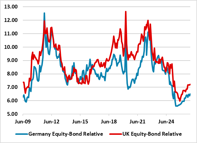 EZ equities have underperformed the U.S. in H2, after the H1 outperformance. U.S. monthly TICS data suggest that net inflows into U.S. equities remain strong, though with more currency hedging occurring (here). Additionally, concern over the EZ economic recovery, plus corporate earnings downgrades, are restraining the EZ equity market. Though the ECB has cut rates by 200bps, the boost to the economy into 2026 is projected to be small. Fiscal policy is also a mixed influence, with Germany getting a defense and infrastructure boost but France restrained by an adverse budget deficit and political splits – Italy and Spain are also fiscally restrained by multi-year fiscal consolidation. Equity-bond valuation for EZ equities is better than the U.S., but Germany is now tight relative to post GFC history (Figure 2) and the 12mth fwd P/E ratio is above fair value. Though we look for two further 25bps cuts from the ECB, this is not enough in itself to see EZ equities clearly outperforming. Finally, any Ukraine peace deal will likely take time and years before sanctions are lifted, while the EZ/EU remain reluctant to get addicted to cheaper Russian gas again. This all means that EZ equities do not have a clear new positive story to decouple from U.S. equities in the next 12 months and we see only small outperformance over this period. 2027 will likely see ongoing EZ economic recovery which can help EZ equities mildly outperform the U.S.. The French fiscal mess will likely come into sharper focus as the May 2027 presidential election looms, but the prospect is that parliament remains against a credible fiscal consolidation path (here).