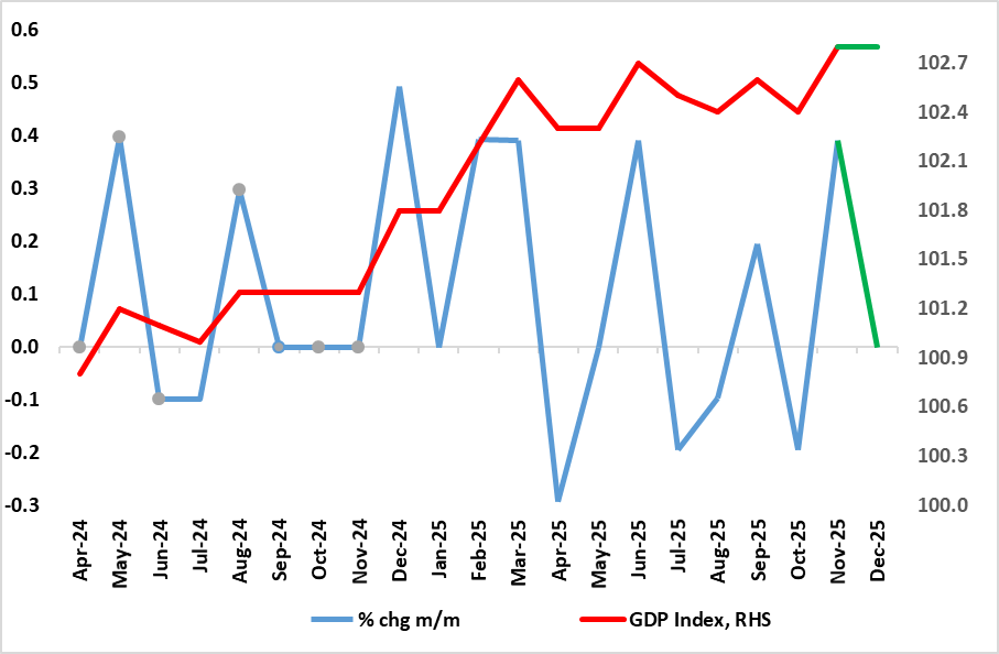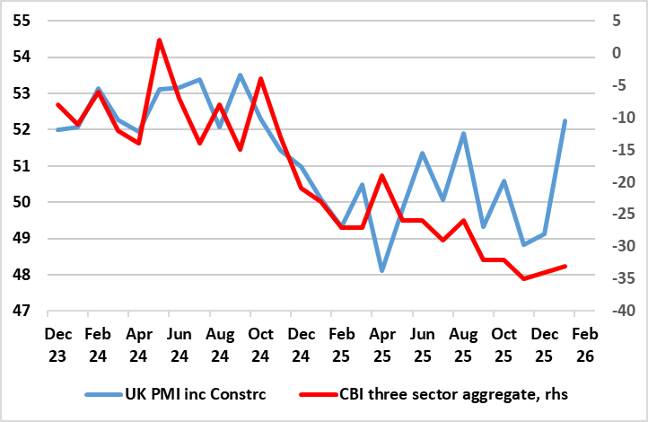 Even given the surprisingly solid November GDP release, this merely returns the level of GDP to where it was in June, albeit briefly as for the latter. Partly undermined by wet and warm weather through the month, we see no change on the December figure, in m/m terms (Figure 1), thus no reversal of the 0.3% November that following an unrevised fall of 0.1% in October 2025 and a growth of 0.1% in September 2025 (revised up from our initial estimate of a fall of 0.1%). This means that Q4 is set for a 0.2% q/q rise which would result in 2025 growth of 1.4%. But we see no more than 0.8% this year; this actually and merely being an extension of the anticipated Q4 result. Regardless, we remain wary about the GDP numbers. Although there have been some better business survey numbers, other such insights provide still sobering reading (Figure 2) as do non-official employment indicators, the latter actually suggesting a worsening backdrop of late.