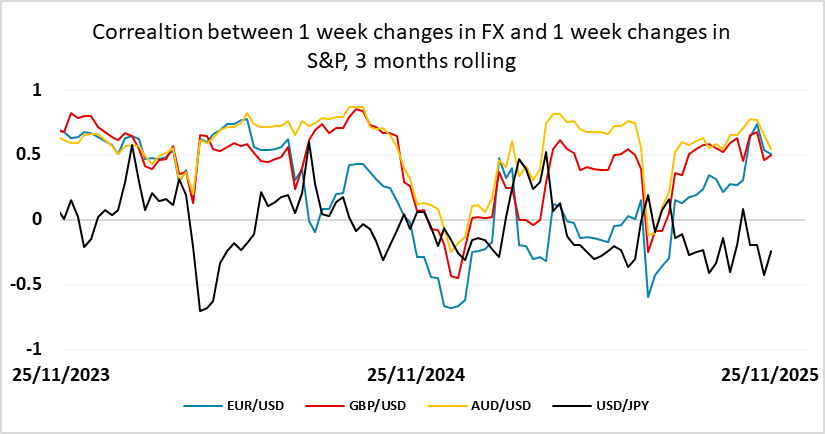 From here, equity gains are likely to prove a little more difficult as we approach the highs seen at the end of October when the S&P traded above 6900. Valuations remain very stretched, and there is now less scope for US yields to fall to boost equity prices. This should limit the scope for JPY declines on the crosses, although there should still be scope for gains in some of the higher yielders. The AUD in particular continues to look very good value relative to yield spreads.