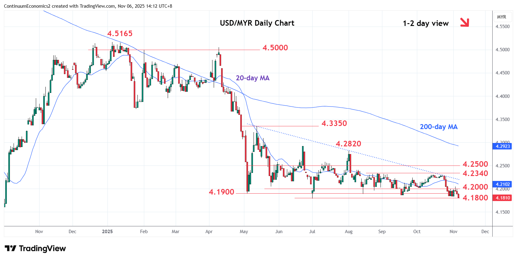06:25 GMT - Consolidation at the 4.2000 level has given way to fresh selling pressure to retest the 4.1900 and 4.1800, May and 1 July current year lows. Negative daily and weekly studies suggest scope for break here to extend losses from the 4.5165 January high. Lower will see room to 4.1500 congestion. Below this will turn focus to the 4.1000 September 2024 year low. Meanwhile, resistance at the 4.2000 congestion which is expected to cap and sustain losses from the 4.2300/40 congestion and 27 August high.