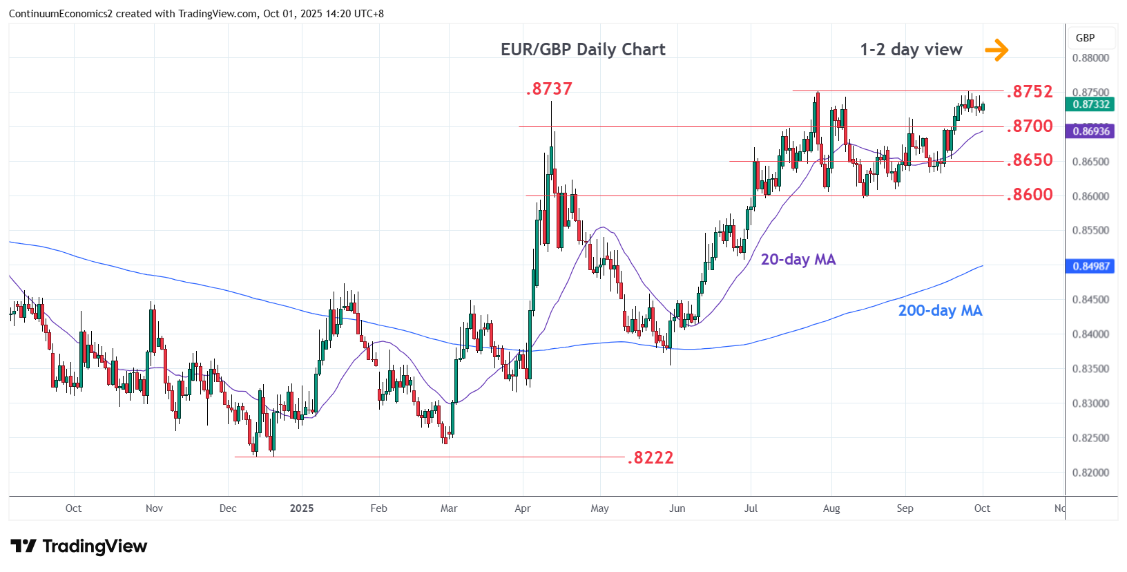06:30 GMT - Little change, as prices extend choppy trade below the .8745/.8752, July-September range highs and 50% Fibonacci level. Daily studies are unwinding overbought readings and suggest room for pullback to retrace gains from the .8600, August low. Break of the .8700 level will fade the upside pressure and see room to the .8650/.8632 area. Meanwhile, resistance at the .8752 high is expected to cap. Break here, if seen, will further retrace the 2022/2024 losses and see room for extension to the .8765 resistance and .8800 level.