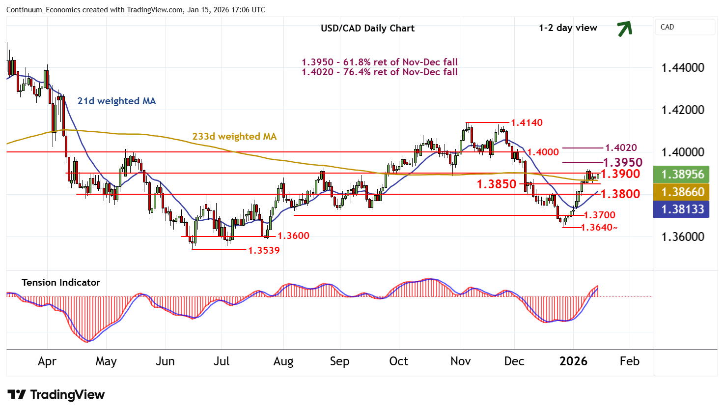 16:45 GMT - Cautious trade has given way to a test of resistance at 1.3900/20, where unwinding overbought intraday studies are prompting fresh reactions. The daily Tension Indicator continues to rise and overbought daily stochastics have ticked higher once again, highlighting room for further strength in the coming sessions. A break abve here will open up the 1.3950 Fibonacci retracement. Rising weekly charts highlight room for continuation towards the 1.4000/20 range, where profit-taking interest could increase. Meanwhile, support remains at congestion around 1.3850. A close beneath here, if seen, will turn sentiment neutral and prompt consolidation above 1.3800.