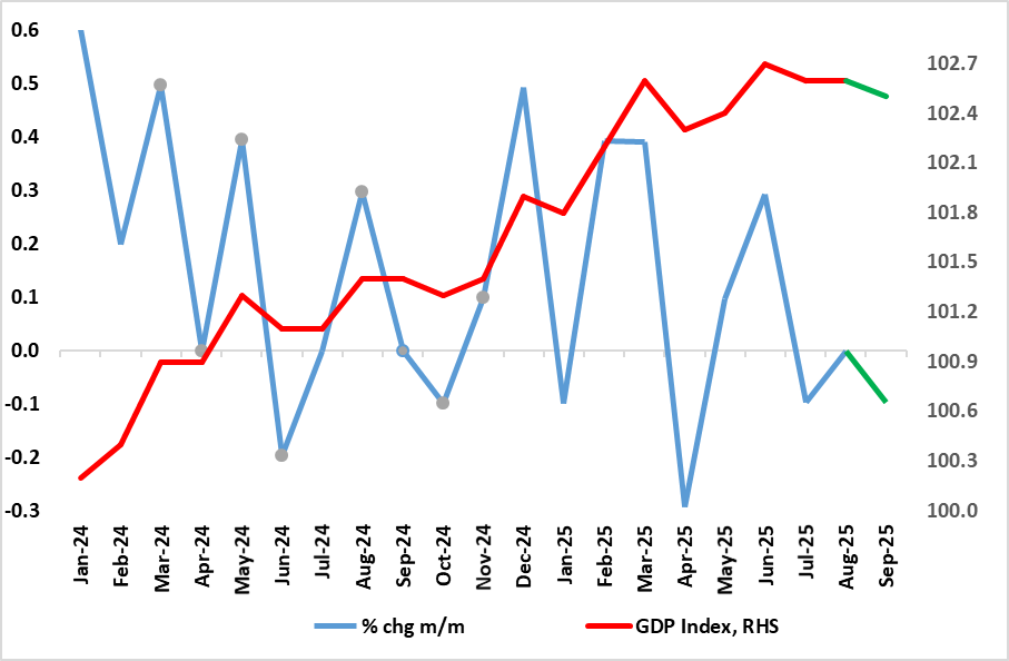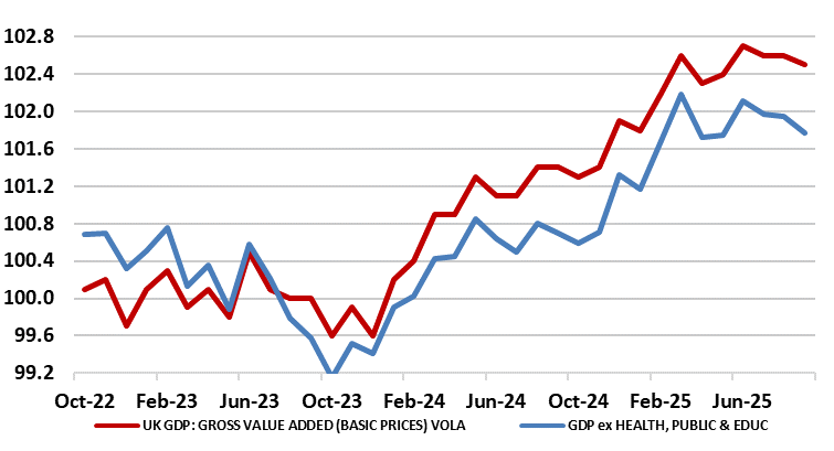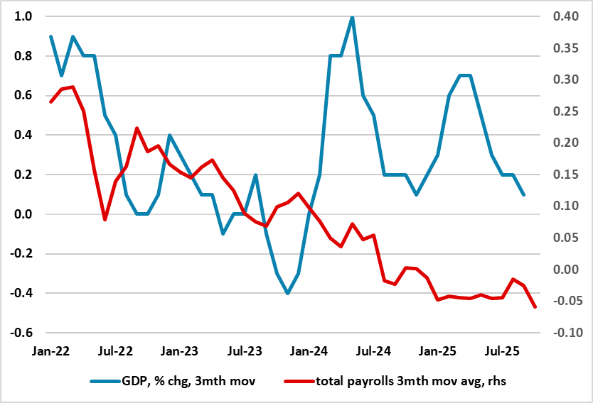 Revisions up to September GDP data now confirm small m/m falls in two of the last three months of data. This put the less volatile three-month rate at a 10-mth low of 0.1% (ie also equivalent to the Q3 result) which we think this reflects very feeble momentum, which may actually be nearer zero if not weaker at least according to some business survey data, especially once construction weakness is incorporated. Indeed, GDP has hardly moved since March. Admittedly, solid GDP outcomes early in the year suggest that UK GDP growth in 2025 will be around 1.4% - the highest in the G7 according to the IMF but this masks what is very much a weak(er) picture in per capita terms, this being a politically important issue amid current immigration issues. Indeed, the IMF see a cumulative growth of 0.9% for 2025 and 2026, the weakest in the DM would save for a similar soggy outlook for Germany. Regardless, the 0.8% GDP projection we have penciled in for next year actually constitutes some modest pick-up in activity momentum.