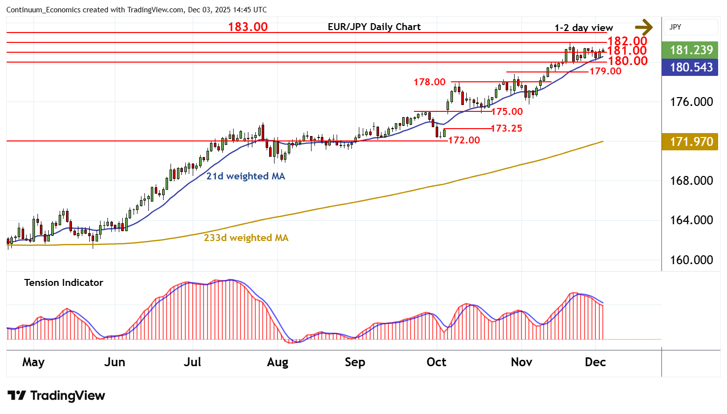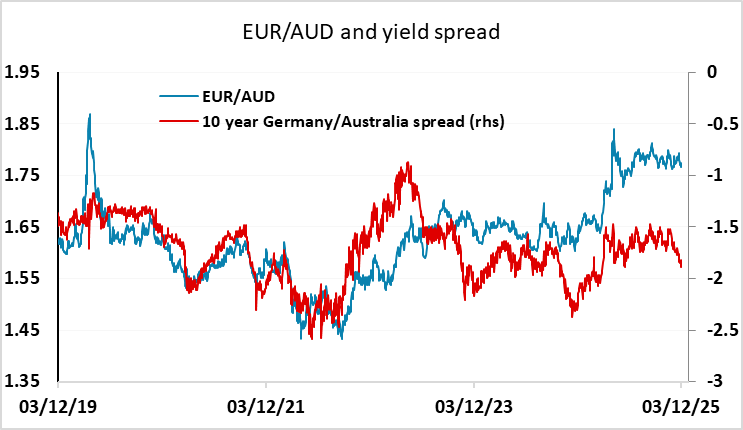 The general picture for the moment looks reasonably risk friendly, with most of the global activity data coming in on the strong side of expectations, but policy expectations still focusing mostly on the prospects for easing. The exceptions are the Japan and Australia, with the market now pricing an RBA hike by the end of 2026. This scope for tightening further underlines the scope for AUD and JPY gains from here. But a JPY recovery still looks hard in a risk positive environment given the extended downtrend, so there should be more scope for the AUD to stretch recent gains.