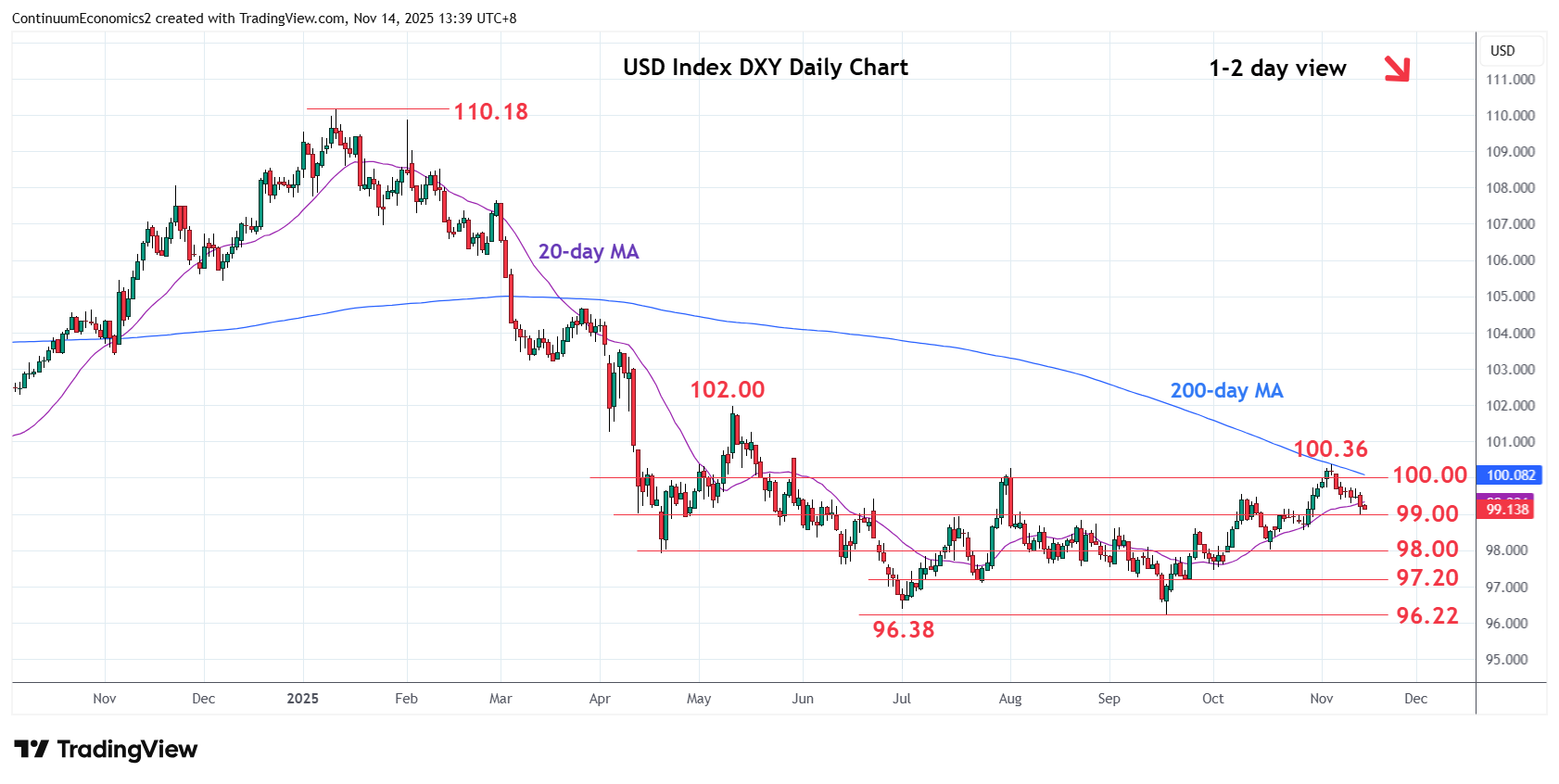 Consolidating test of the 99.00 level but pressure building on the downside and see room for break to further retrace the September/November rally