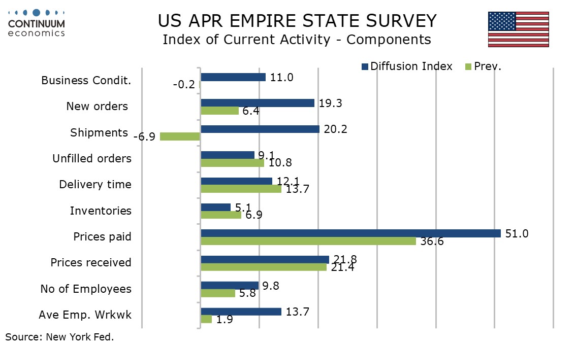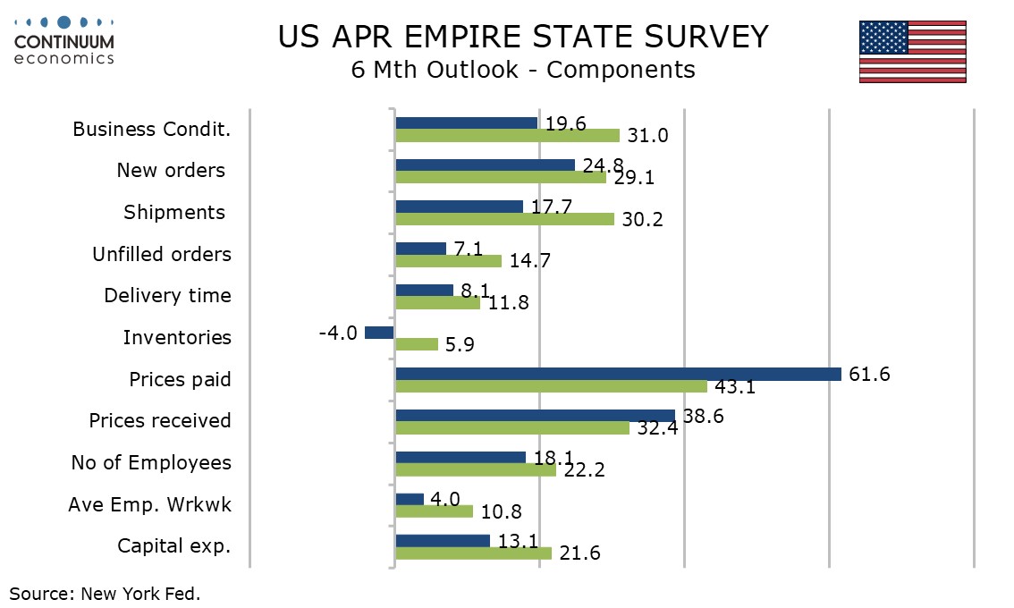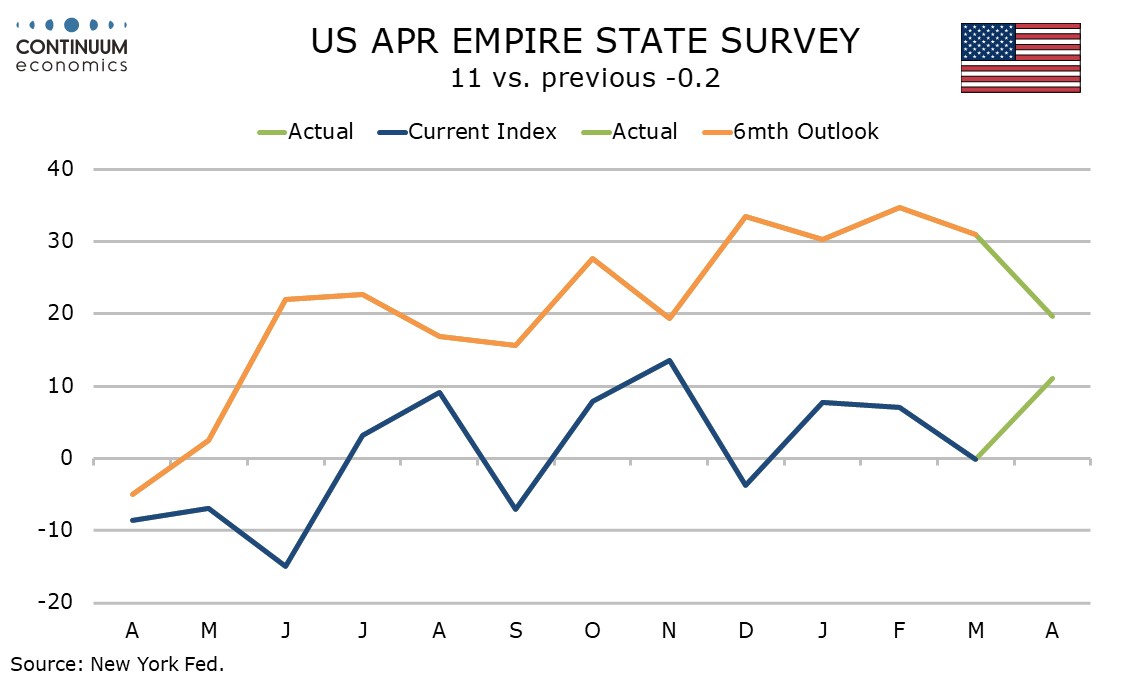 April’s Empire State manufacturing index at 11.0 is up from a near neutral -0.2 in March and the strongest since November, suggesting activity is resilient to the Middle East crisis. 6-month expectations have however taken a hit, falling to 19.6 from 31.0, this the lowest since November.